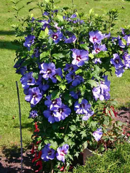 Высота взрослого растения достигает 1,5-2 метров, что позволяет использовать его как в одиночных посадках, так и в живых изгородях. Гибискус Blue Bird прекрасно сочетается с другими многолетниками и кустарниками, создавая гармоничные композиции.